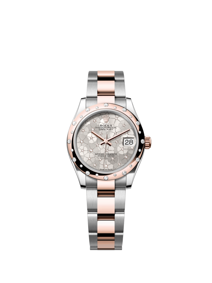 The Oyster Perpetual Datejust 31 is available in Everose gold and Oystersteel with a diamond-set silver-toned floral dial and an Oyster bracelet. -m278341rbr-0031