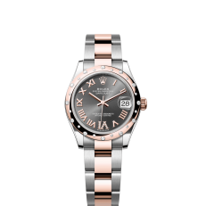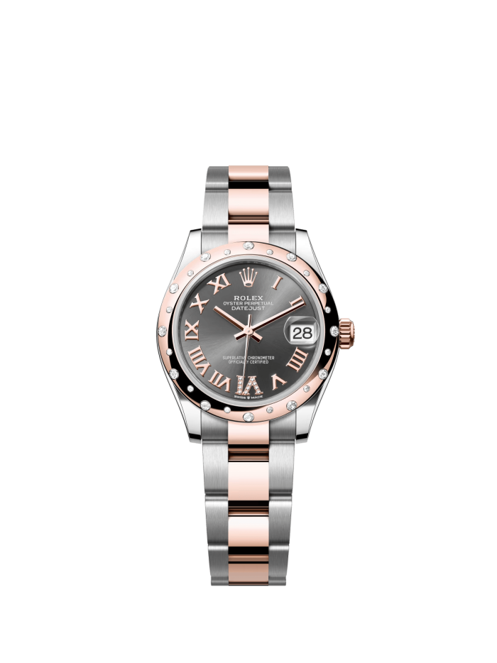 The Oyster Perpetual Datejust 31 is available in Everose gold and Oystersteel with a grey dial set with diamond plates and an Oyster bracelet. -m278341rbr-0029