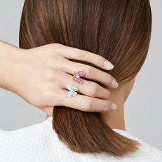 Two Butterfly Between the Finger ring. 18K rose gold. round pink sapphires. rhodium plated 18K white gold. round and marquise-cut diamonds; diamond quality DEF. IF to VVS.